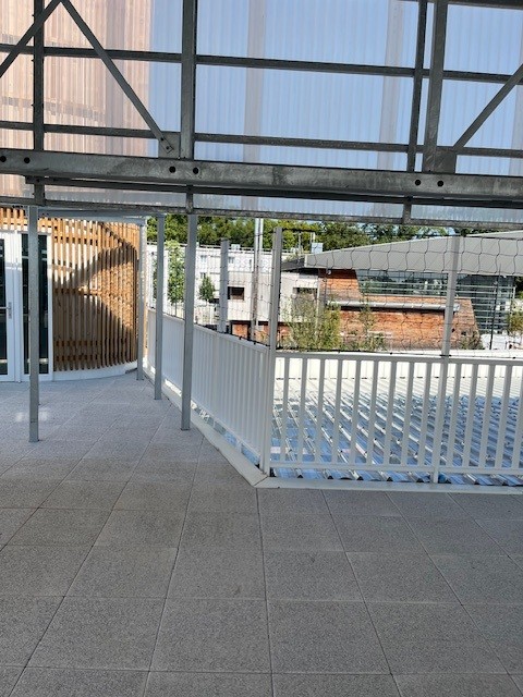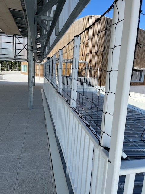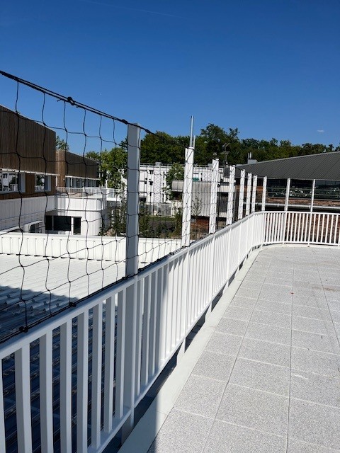 Afin de répondre aux besoins sécuritaires de notre client pour des besoins pare-ballons d'une construction d'école avec une cour de récréation surélevé , AHM FILETS à su s'adapter au besoin en filet sur mesure et s'adapter a la structure non préalablement percée.