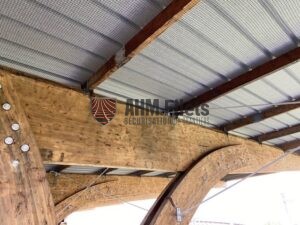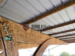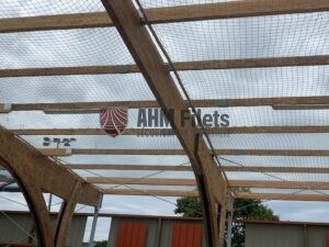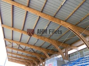 Notre entreprise (AHM FILETS) est intervenu sur une tribune en deux phases. Dans un premier temps nous avons poser les filets de sécurité en sous face afin que notre client soit en sécurité pour mettre en place son bac acier sur la toiture.
