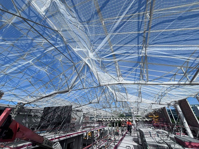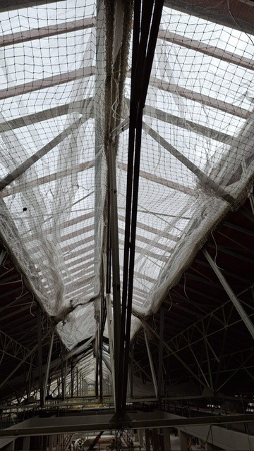 La société AHM Filets est intervenue sur le site des Grandes Serres de Pantin pour la mise en sécurité de la toiture, comprenant la pose de filets de sécurité et de pare-gravats, en vue de permettre l’intervention des couvreurs en toiture dans des conditions optimales de sécurité.