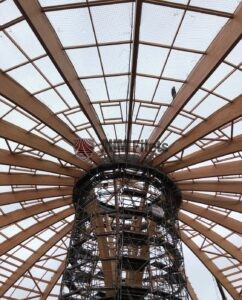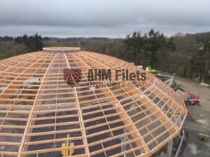 Ahm filets est intervenu sur un dôme en posant les filets avec un tirage par travée sur une charpente bois ce qui nécessite beaucoup de technique et de professionnalisme mais avec sécurité en posant à la nacelle à plus de 13m de haut.