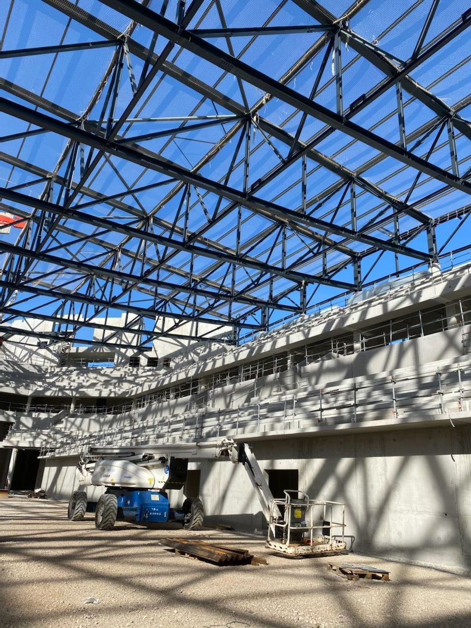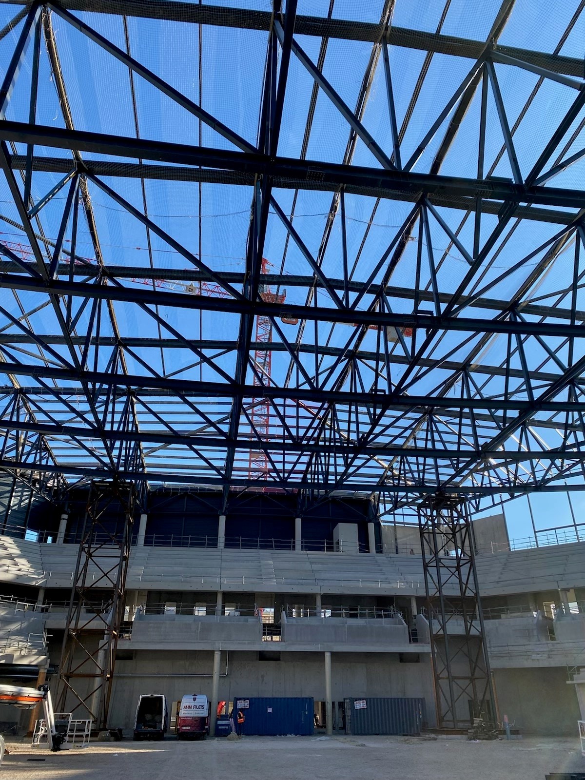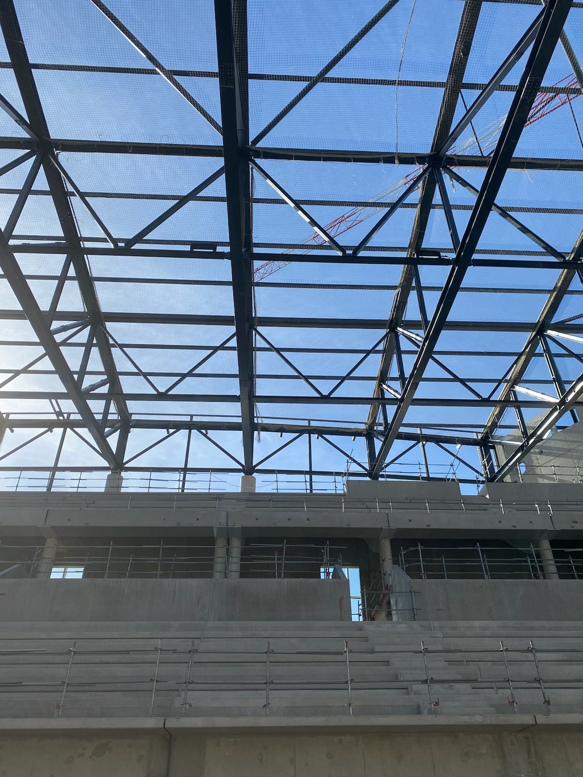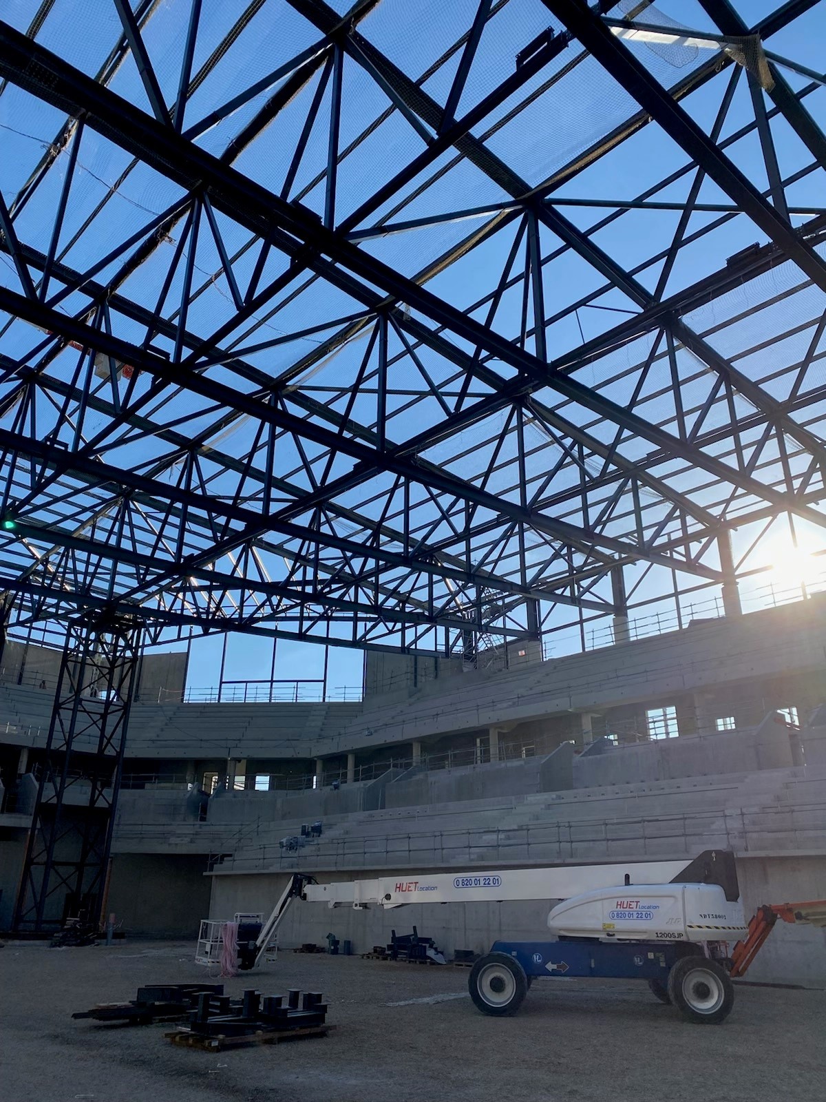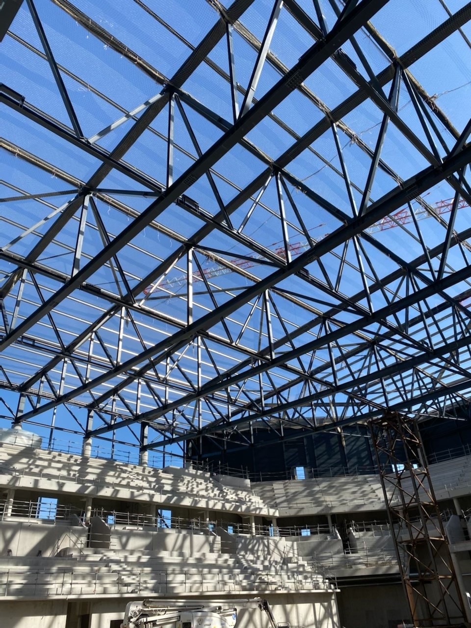 La présence des gradins nous a contraint à employé un mode opératoire différents de celui utiliser couramment, tout en respectant les règles de sécurité imposée sur le chantier. Par la suite, nous avons poser les filets de sécurité en sous face en plusieurs étapes afin que notre client soit en sécurité pour mettre en place son bac acier sur la toiture. La filets de sécurité ont été tirés au plus près de la charpente travée par travée, pour limiter la hauteur de chute.