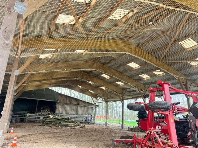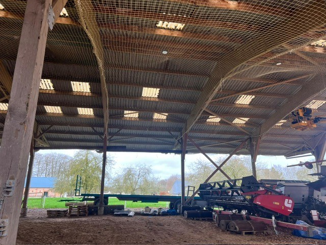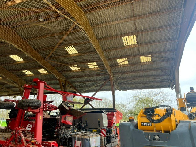 Dans le cadre de la rénovation de ce bâtiment agricole, nous avons réalisé la mise en place de filets de sécurité en sous-face de toiture, afin de sécuriser durablement les interventions et l’exploitation future du site.